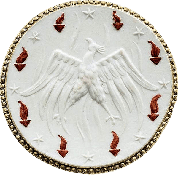 Beschreibung Rückseite: Ein aus der Flamme aufsteigender Phönix mit dem Kopf nach links. Um das Motiv herum abwechselnd acht fünfstrahlige Sterne, die zum Teil radial ausgerichtet sind und acht kleine Urnen mit Flamme.