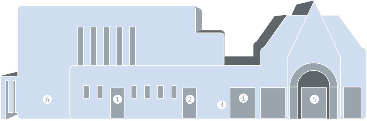 1) Büro 2) Briefkasten 3) Klingel 4) Urnenzimmer 5) Leichenhalle 6) Feierhalle